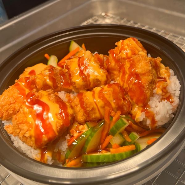 Fried Salmon, rice, pickled veggies with spicy mayo and teriyaki sauce.